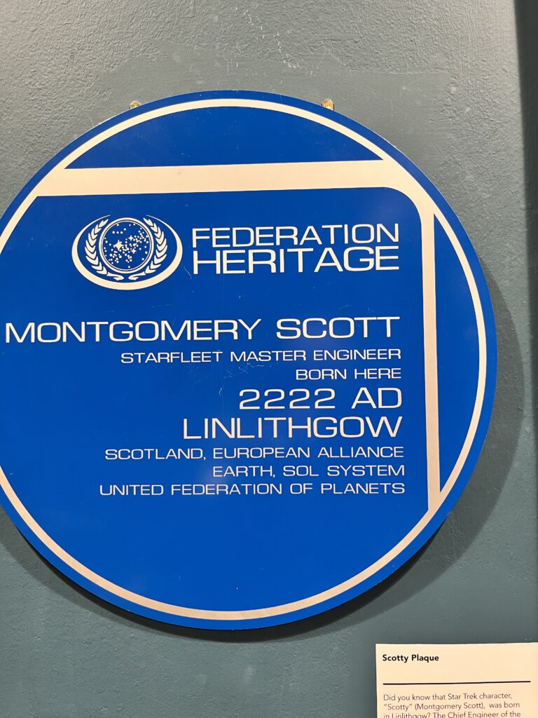 But that didn’t stop the good burghers of Linlithgow near the Union Canal. They honoured the Galactic Engineer with this plaque in their local museum: